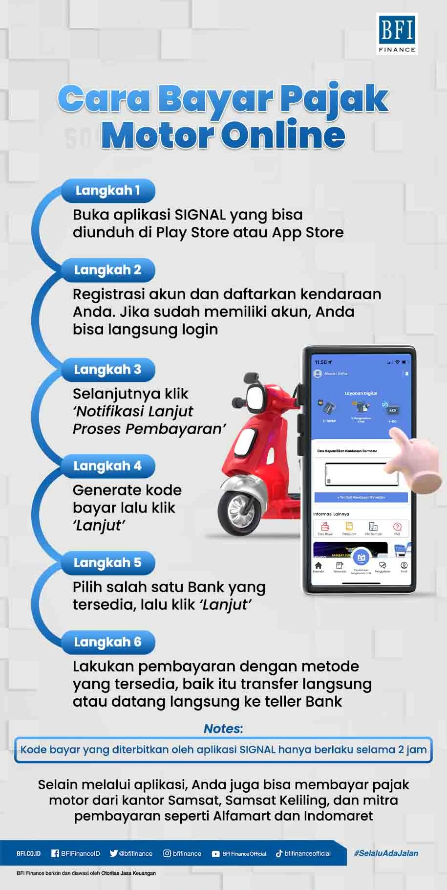 Malas mengantre atau berhalangan hadir ke Samsat? Jangan khawatir karena sekarang Anda bisa bayar pajak motor secara online, yakni melalui aplikasi SIGNAL!