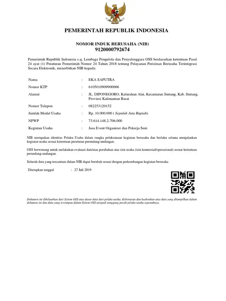 Contoh Nomor Induk Berusaha. Image Source: Scribd/Eka Poetra